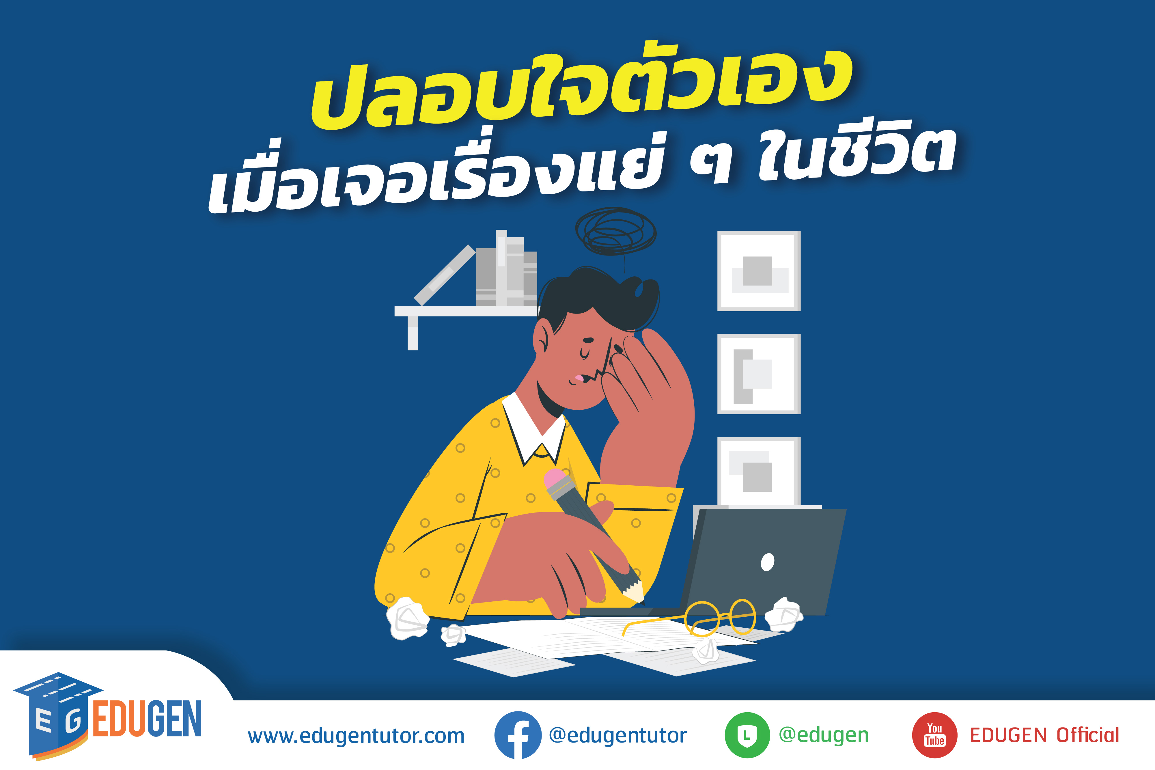 ไม่มีใครที่ไม่เคยเจอกับวันแย่ ๆ ขอแค่เราไม่บั่นทอนตัวเอง และไม่ปล่อยให้ความคิดด้านลบมาเกาะกินใจ จนส่งผลเสียกับสุขภายกายและสุขภาพใจของเราก็พอ อย่างตัวพี่ EDUGEN เอง เวลาเจอ Bad Day หรือวันห่วย ๆ ก็มีเฟลบ้าง เสียความรู้สึกบ้าง แต่ก็จะพยายามปลอบใจตัวเองว่าเดี๋ยวมันก็ผ่านไป วันนี้แย่ก็ไม่ได้แปลว่าพรุ่งนี้หรือวันต่อ ๆ ไปจะแย่นี่นา หลับตานอนฟังเพลงโปรด หรือหาหนังดี ๆ ดูสักเรื่อง กินของอร่อยให้จิตใจผ่อนคลาย เยียวยาหัวใจตัวเองให้แข็งแรง เพื่อตื่นมาเจอกับสิ่งดี ๆ ในวันต่อไปกันดีกว่า…