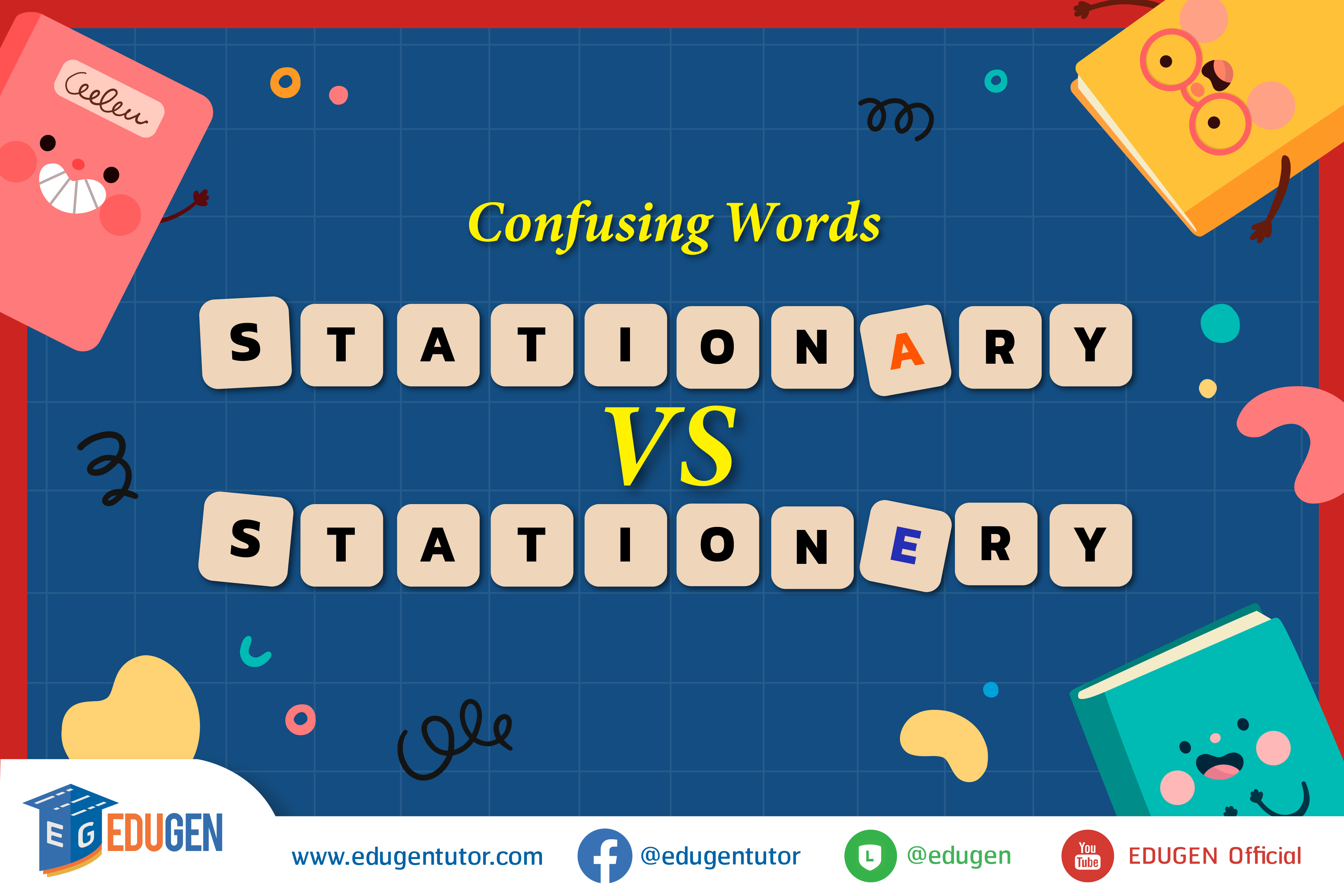 วันนี้พี่ EDUGEN จะพาน้อง ๆ ทุกคนไปเรียนรู้ศัพท์แสนสับสน หรือ Confusing Words ระหว่างคำว่า Stationary (adj.) กับ Stationery (n.) ซึ่งทั้ง 2 คำนี้ให้ความหมายที่ต่างกันอย่างสิ้นเชิง ถ้าจำแล้วนำไปใช้ผิด ๆ งานงอกแน่นอน เอาเป็นว่า 2 คำนี้จะต่างกันยังไง และต้องใช้วิธีไหนที่จะทำให้หายสับสน ตามพี่ EDUGEN มาทางนี้เลยยย