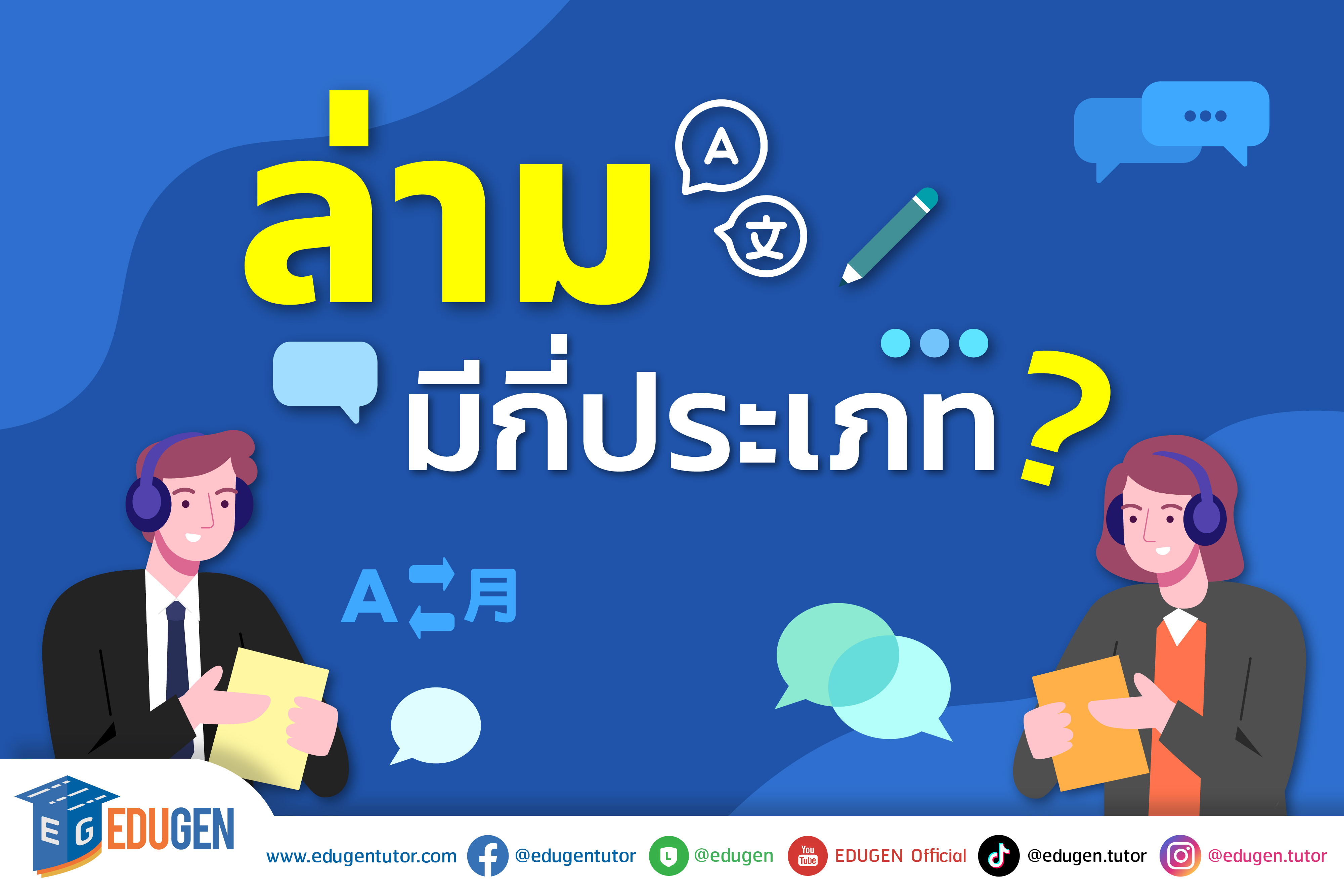 ถ้าพี่ EDUGEN จะพูดคำนิยามของล่ามแบบเข้าใจง่าย ๆ ก็คือ ผู้แปลภาษาจากภาษาหนึ่งเป็นอีกภาษาหนึ่ง โดยการพูด ว่าแต่! มีใครรู้บ้างว่าล่ามมีกี่ประเภทกันแน่? เพราะบางครั้งเราก็จะเห็นล่ามบางคนแปลหลังจากผู้พูด พูดจบไปประมาณ 3 - 7 ประโยค หรือบางคนก็แปลตามผู้พูดแบบทันที วันนี้ตามพี่ EDUGEN มาหาคำตอบให้หายสงสัยกันเลยดีกว่าว่า ล่ามมีกี่ประเภท?